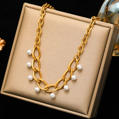 This 316L Stainless Steel necklace combines vintage and trendy styles for a fashion forward look. The gold color link chain is both elegant and punk, with a touch of pearls for added sophistication. Perfect for special occasions or everyday wear, this necklace is a stylish addition to any outfit.